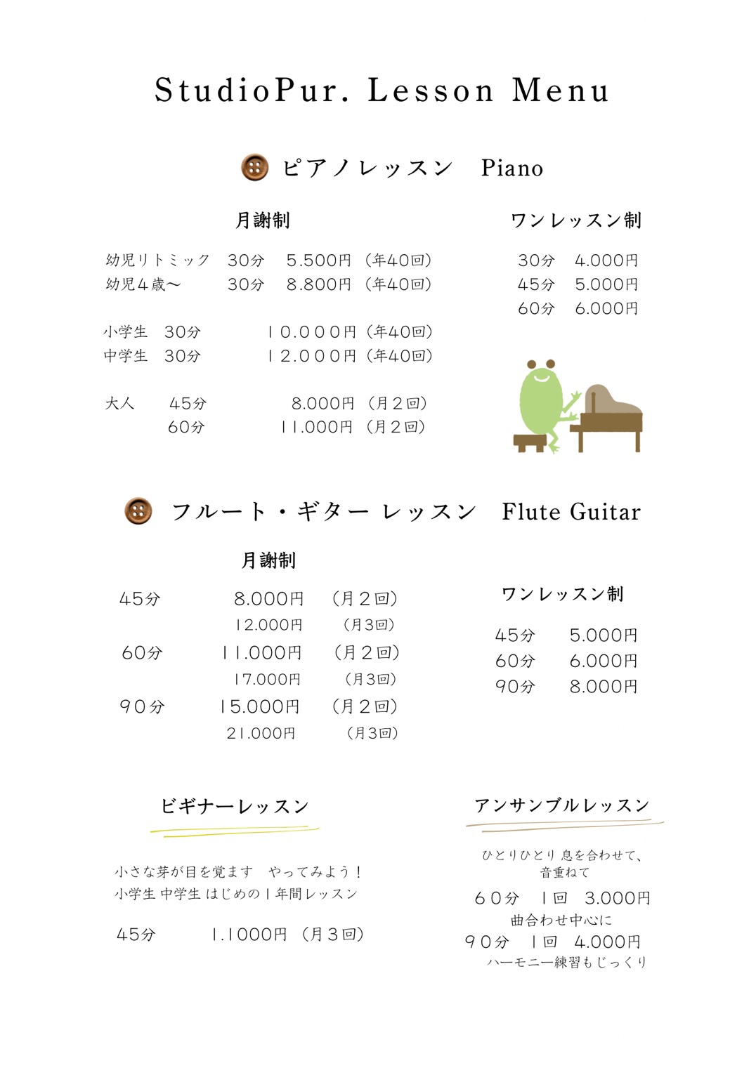 全て税込価格です。設備費、冷暖房費ありません。年会費ありません。 レベルアップによる 月謝値上げも特にありません。 レンタル楽器あり(有料)音楽の素朴な疑問質問大歓迎です。 入会金 ¥3.000 只今体験レッスン受付中 体験レッスンお問い合わせ Pur.のとびらを開けると・・ 明るくゆったり 広いレッスン室